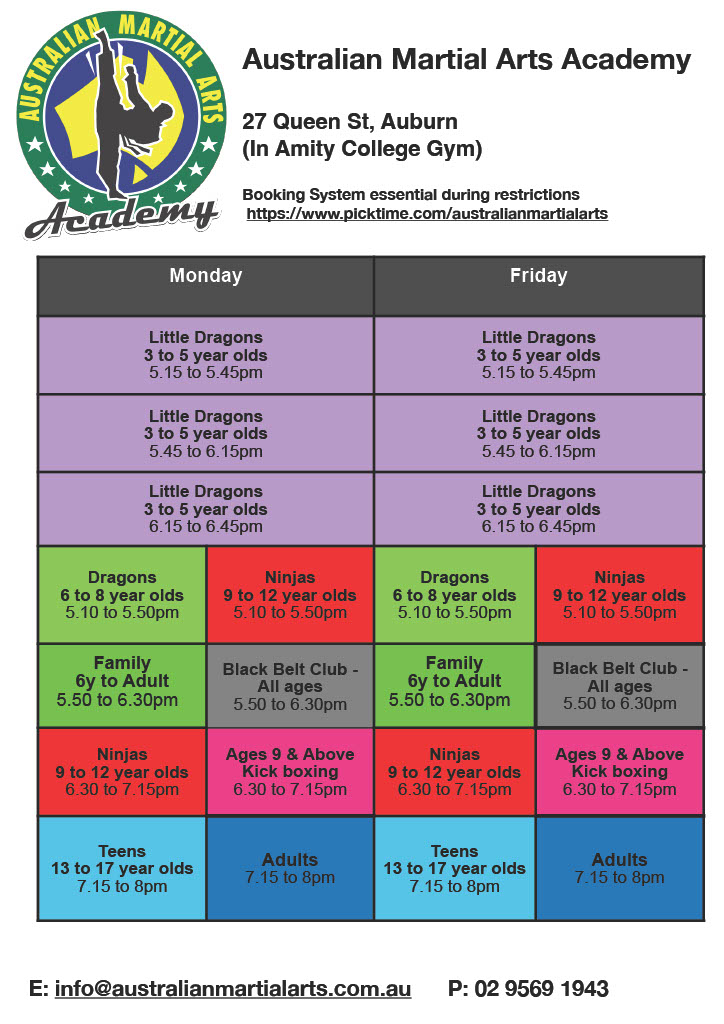 Ran by Mr Mark Loughran, Mr Gericho Hills & Mr Lincoln, our Auburn location has amazing instructors, access to all age groups from 3 years and up and advanced programs. Practice focus, discipline, fitness and FUN all in a safe and structured environment while having the flexibility of mixing class times to suit your needs. Classes run all year round except for public holidays to give you as much flexibility as possible.